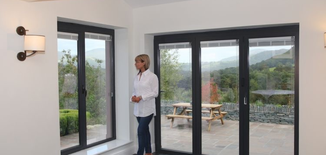 Panouri mari din sticlă, pentru o vedere panoramică și acces facil la exterior.